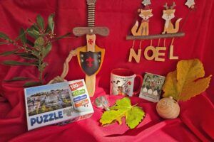 Mug princesse pour savourer sa potion magique comme un vrai héros du royaume ; puzzle pour reconstituer pierre après pierre les ruelles et remparts de la magnifique cité de Vézénobres, haut lieu d’histoire et de figues ; épée et son fourreau, l’accessoire indispensable pour défendre le château avec bravoure ; jeu de 7 familles pour partager des fous rires en famille autour d’un grand classique ; chique à la figue, une douceur sucrée pour les petits gourmands après leurs exploits.