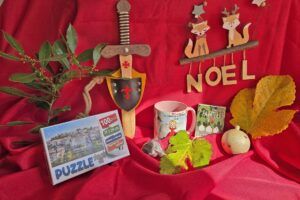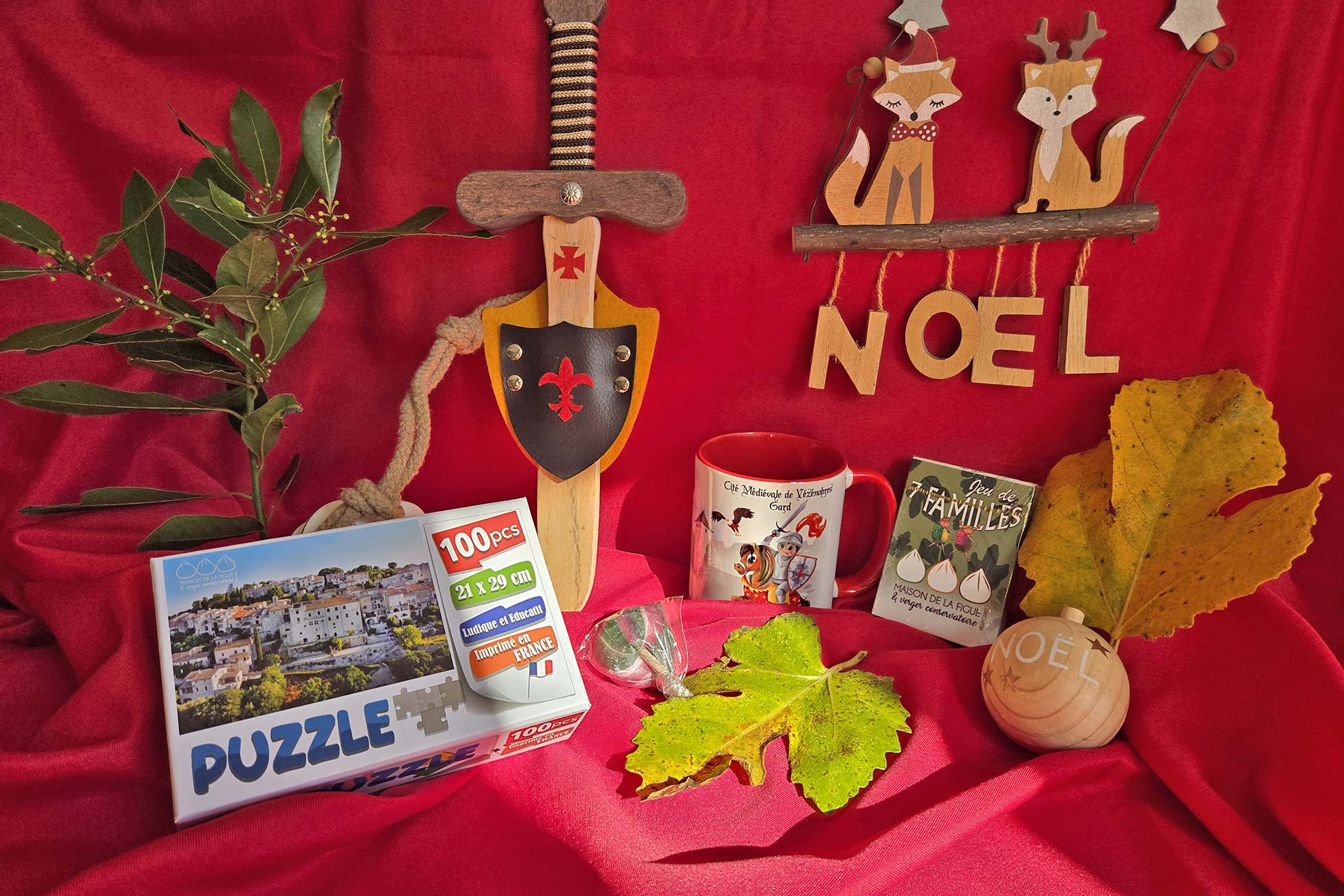 Mug chevalier pour savourer sa potion magique comme un vrai héros du royaume ; puzzle pour reconstituer pierre après pierre les ruelles et remparts de la magnifique cité de Vézénobres, haut lieu d’histoire et de figues ; épée et son fourreau, l’accessoire indispensable pour défendre le château avec bravoure ; jeu de 7 familles pour partager des fous rires en famille autour d’un grand classique ; chique à la figue, une douceur sucrée pour les petits gourmands après leurs exploits.